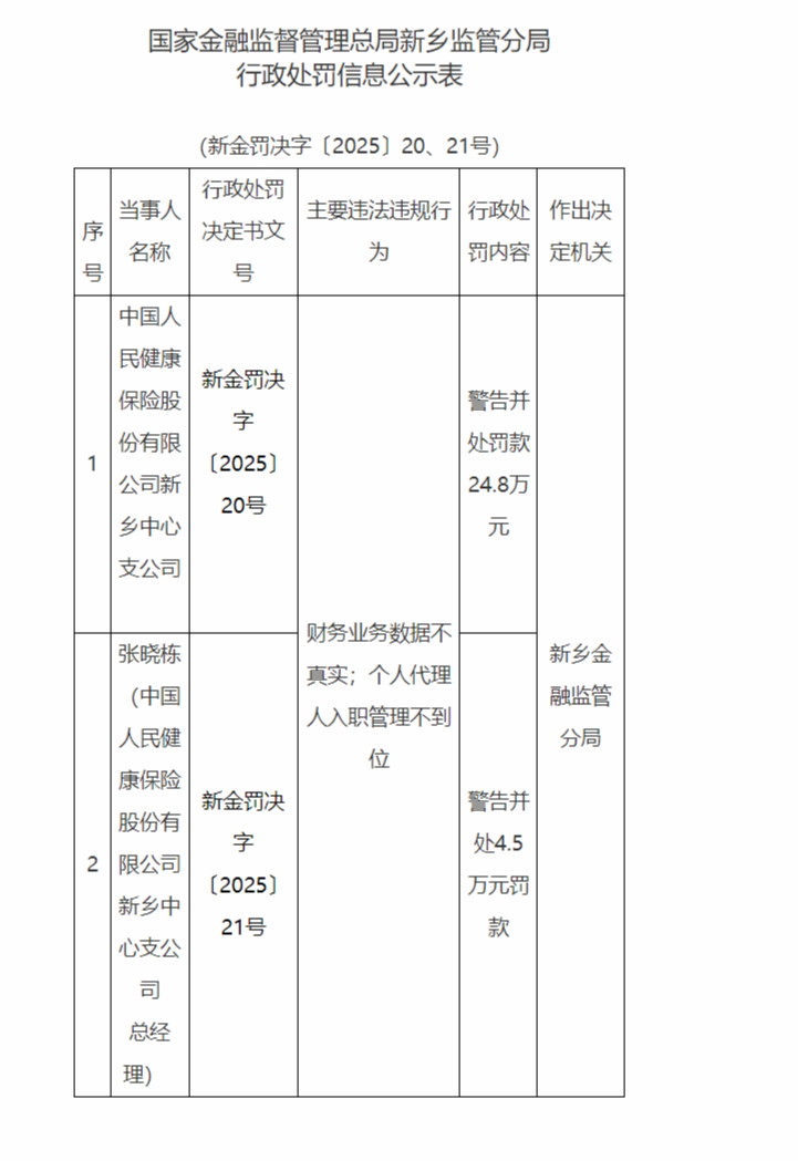 张晓栋(中国人民健康保险股份有限公司新乡中心支公司总经理),被警告并处4.5万元罚款。